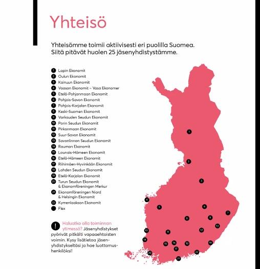 Suomen Ekonomit palvelee jäseniään heidän uransa joka käänteessä ja on ekonomien edunvalvoja työelämässä, yhteiskunnassa ja koulutuksessa.